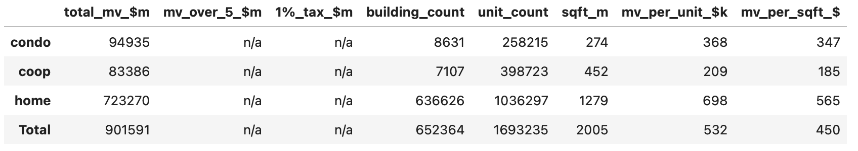 Easy enough. The DOF Property Valuations are readily available from Open Data and every parcel has a classification code that tells us if it’s a co-op, condo, home or rental building.
