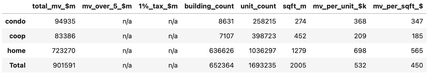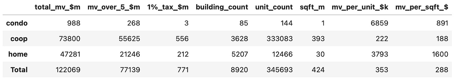 All this together explains why co-ops have such a large share and condos have such a low share: this tax applies to all co-op buildings over $5m but only condo units and 1-3 family homes that are over $5m. Those are very different!