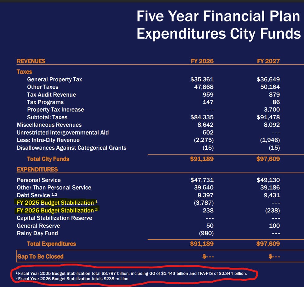 The reasons for the collapse in reserves are beyond the scope of this, but it’s easy to tell a story about “underbudgeting of key services like shelter, special education, rental assistance, and overtime.” The Comptroller did exactly that in August 2025 when they warned of a $4.2bln gap in the FY26 budget. That gap is what is now being covered by the $3.5bln drop in the BSA roll and a $980mln draw from the Rainy Day Fund.