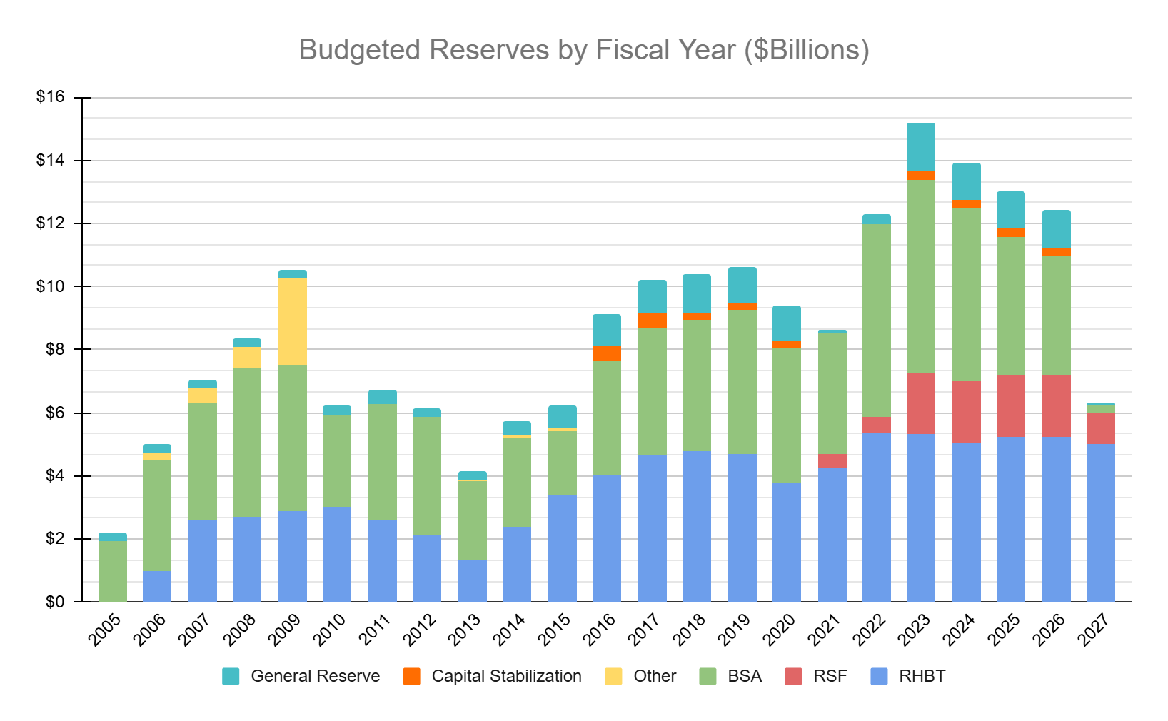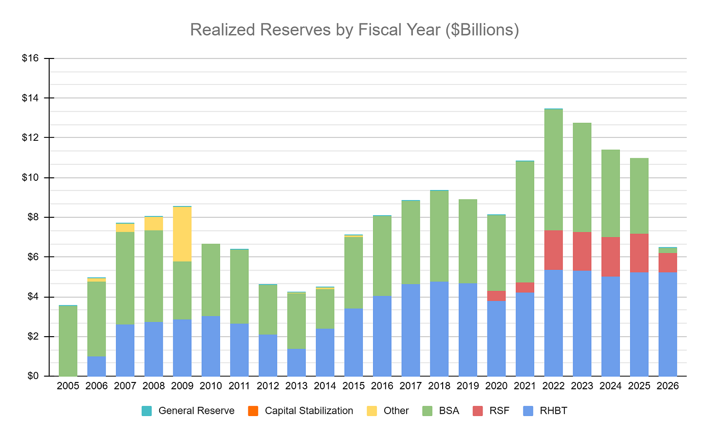 But there’s another component that functions exactly like a reserve even though it isn’t called one: the Budget Stabilization Account, usually referred to as “the roll” or the BSA.
