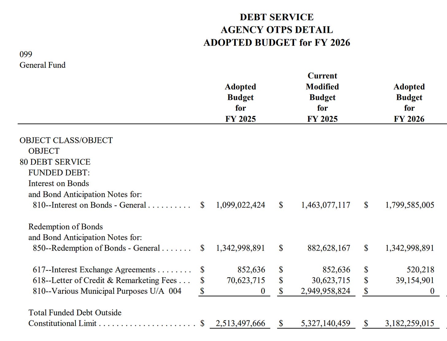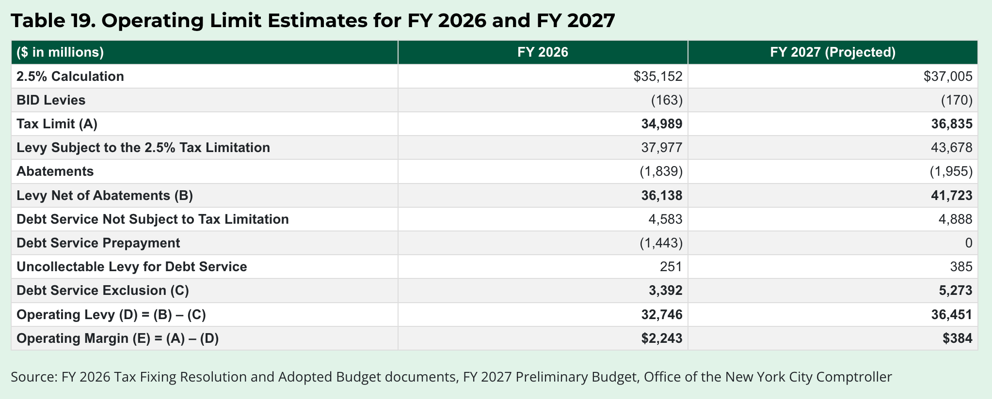There you have it. The Comptroller estimates $384 million of room to spare in FY27 after excluding $1,955 million of abatements, $4,888 million of debt service and $385 million of uncollectable taxes. This is inclusive of the proposed 9.5% increase in property tax rates.